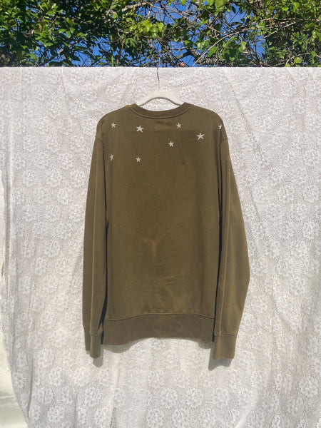 Thrifted dark olive crewneck sweatshirt with original appliqué camping tent and blockprinted stars + moon. Tent door is tied back but can be unrolled, batting was sewn under the pillows + sleeping bag so it will be a little puffy/squishy, like a real pillow and sleeping bag! Get it? Tent poles are yarn sewn on with a couching technique.
