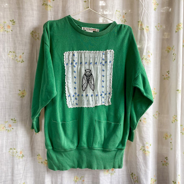 Thrifted green crewneck sweatshirt with antique hankie with cicada blockprint on the front
