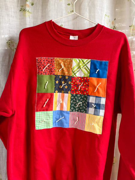 Thrifted red crewneck sweatshirt with patchwork quilt top sewn on and bound with yarn ties