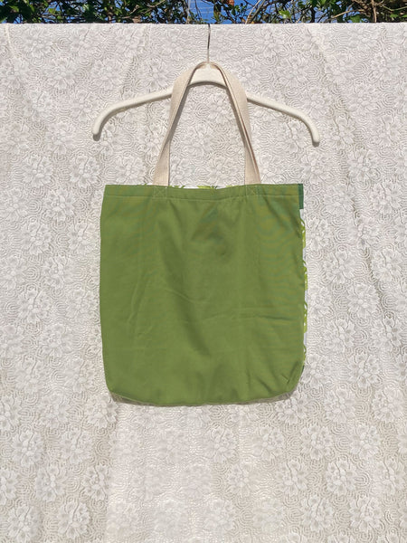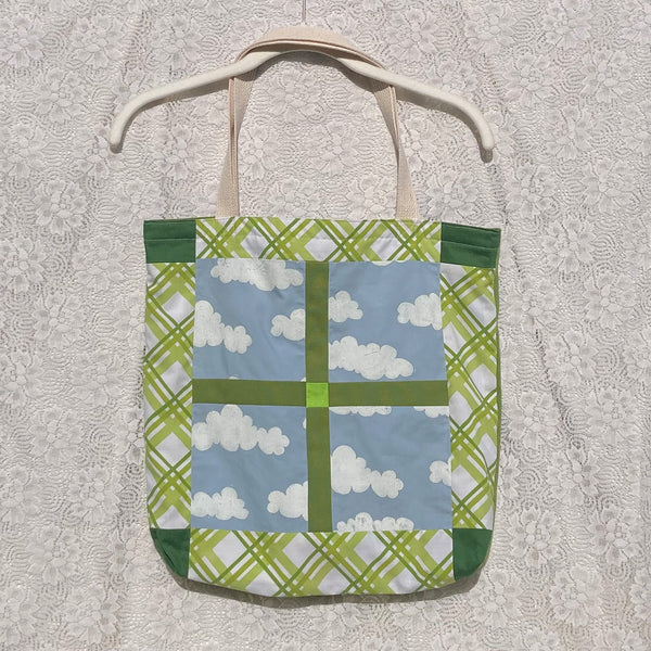 Window Gazer tote bag. Secondhand fabric printed by hand with original cloud blockprints, then sewn together in a window design. 21" straps.